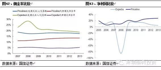 此外,Expedia批发模式下收益率要高于Priceline的批发模式,2013年Expedia收入/交易额约为18.72%,Priceline在17%左右,主要是由于Expedia的批发模式(主要来自酒店业务)的盈利能力要强于Priceline的Name your own price模式(C2B 下,酒店为特价产品,给OTA的盈利空间有限)。而Priceline的代理模式盈利能力远远高于Expedia。2013年,Expedia的代理模式佣金率为5.2%,而Priceline为13.5%,这主要由于Expedia的代理模式以机票预订业务为主,而Priceline的代理模式主要以Booking的酒店预订业务为主,酒店的代理佣金率明显高于机票。从净利率来看,Expedia一度净利率更高,但2008年后均低于Priceline(2008年Expedia出现亏损主要是由于Q4商誉和无形资产减值30亿美元导致)。2013年Expedia净利率仅4.88%,明显低于Priceline 净利率27.86%。
