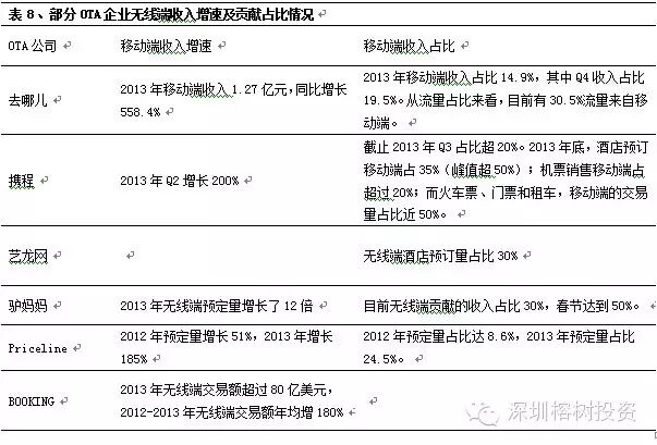移动在线旅游仍处于高速增长期,竞争格局尚未确定,各家OTA在2013年底到2014年,进一步加大在移动端的投入,价格战也更加激烈。在各家OTA积极部署推广移动互联业务的背景下,各家OTA移动端收入保持高速增长,贡献也逐步提升。去哪儿2013全年无线端总收入达到1.27亿元,同比增长高达558.4%(Q3、Q4增长386%-391%)。