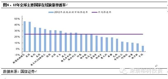 从全球范围看,中国2010、2012年在线旅游仅相当于排名第一的美国市场5-7%,2012年欧美等国在线旅游渗透率达到40%以上,我国8%基本处于国际最低水平。从渗透率提升过程看,美欧都是在接近40%后增速才相对放缓,所以在线渗透率饱和水平可能在40%-50%左右,中国目前的8%还有非常大发展空间。