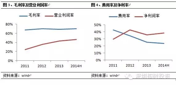毛利率提升和费用率下降促使净利润增速大幅超过收入增速。上半年实现收入3.64亿港元,同比增长30.4%,分季度看Q1/Q2分别实现1.61亿/2.03亿,同比分别增长30.89%/30.13%。上半年公司综合毛利率70%,同比上升1个百分点,分季度看Q2季度毛利率69%与去年同期持平,环比一季度的72%略有回落,公司费用控制良好,受13年1263万上市费用减少影响,上半年费用率下降3.5%个百分点至24%,毛利率提升,费用率下降及利息收入贡献共同促使公司净利率从33%提升至38%,上半年净利润增长50.2%至1.4亿港元。