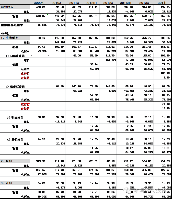 2)生物药销售的毛利率上升4.6个百分点至72.2%,而2013年半年度的毛利率则为67.6%。口蹄疫疫苗、猪瘟疫苗及猪蓝耳病疫苗2014年半年度之毛利率分别为67.7%、65.8%及79.6%(2013年半年度:分别为61.3%、66.1%及75.4%)。高毛利率原因:主要是由于口蹄疫疫苗及猪蓝耳病疫苗较高毛利率。口蹄疫疫苗的毛利率上升主要因发挥更佳经济规模效应而上升6.4%,而猪蓝耳病疫苗的毛利率上升部分由于本期间出售优质猪蓝耳病疫苗而上升4.6%(优质猪蓝耳病疫苗较出售予省级兽医站之疫苗价格高,因此毛利率也高)。