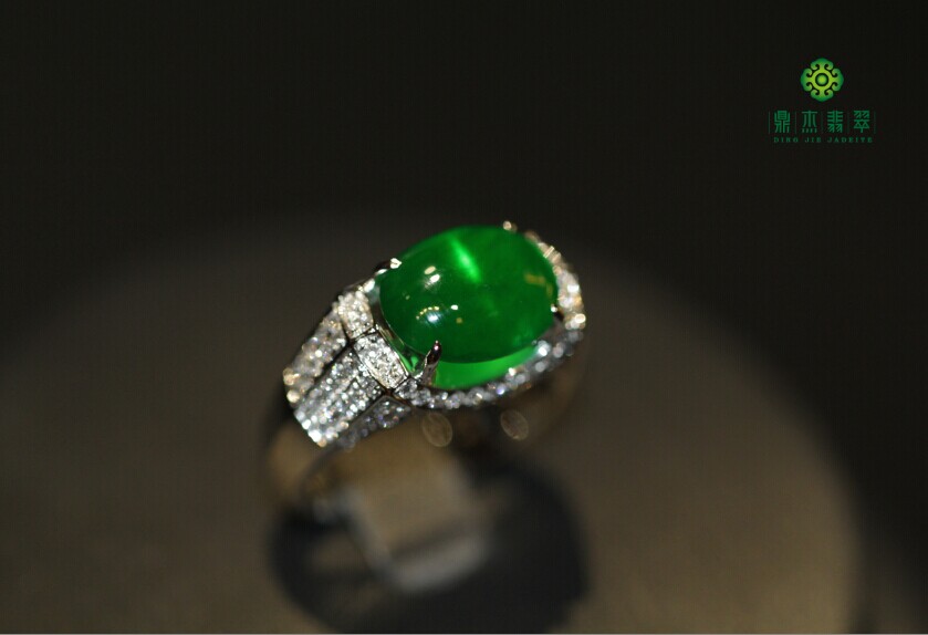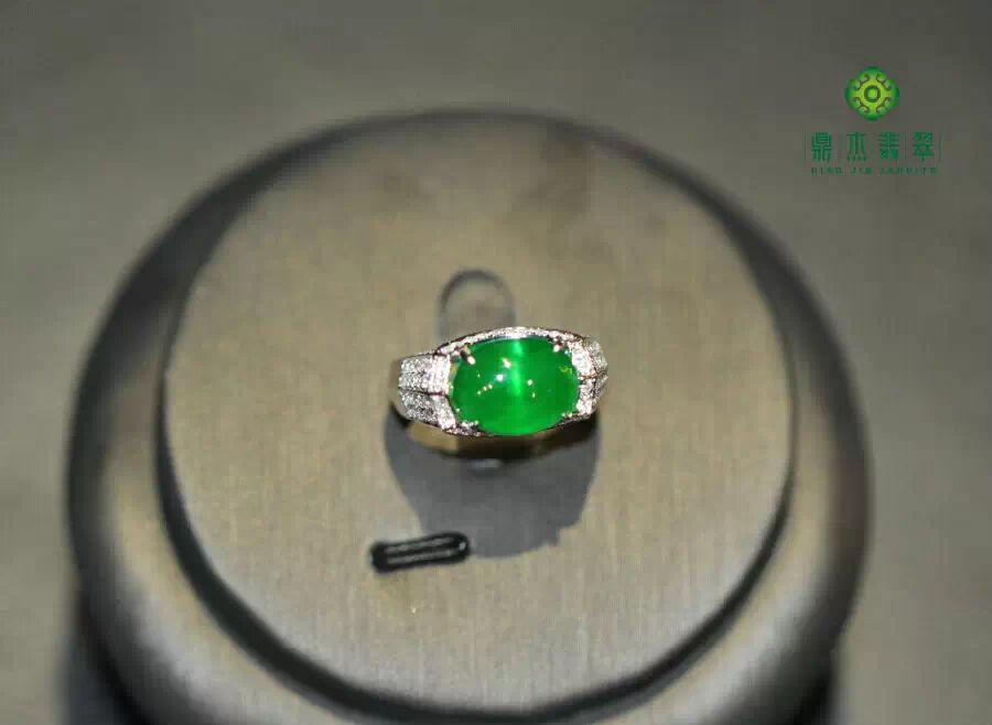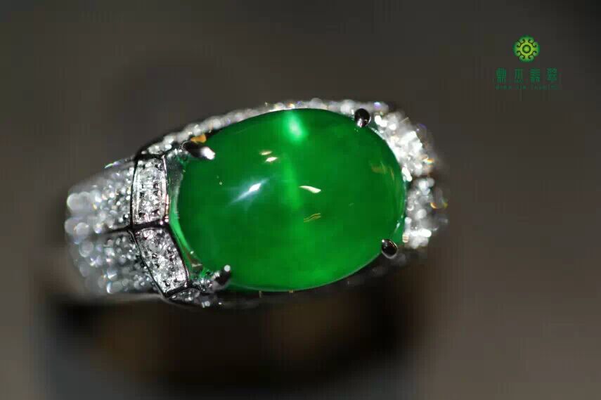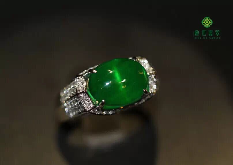 之所以此款戒指具有“猫眼效应”是因为采用种水色俱佳的满绿翡翠蛋面,通透、荧光足,通过将戒指底托通过特殊弧面抛光工艺,将透过翡翠的光线反射回来,与自身荧光重合,即产生了“猫眼效应”的视觉效果,极为难得。