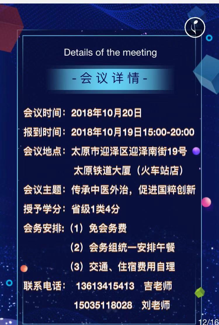 今天山西太原的外治特色疗法学术会议。欢迎大家参加!我会在会议上分享乳腺疾病特色外治法,欢迎交流!