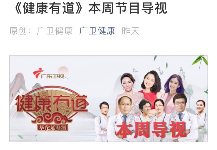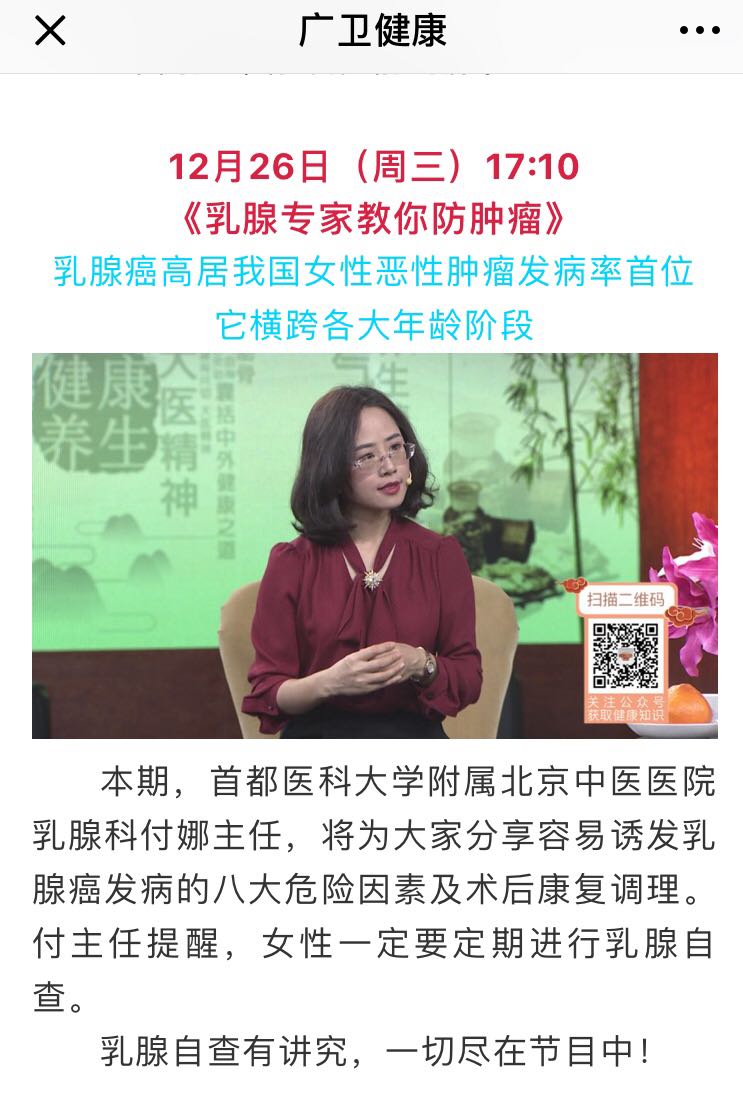 广东卫视,健康有道,今晚17:10播出,我科付娜主任讲述乳腺癌预防。欢迎收看!