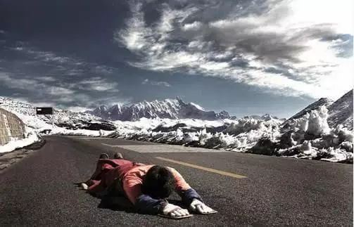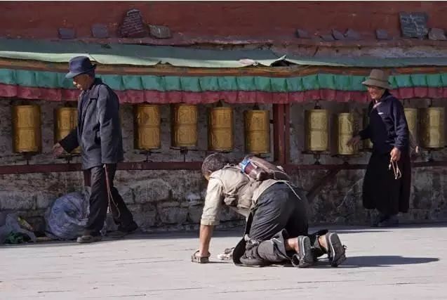 磕头朝圣的人在其五体投地的时候,是为“身”敬;同时口中不断念咒,是为“语”敬;心中不断想念着佛,是为“意”敬。