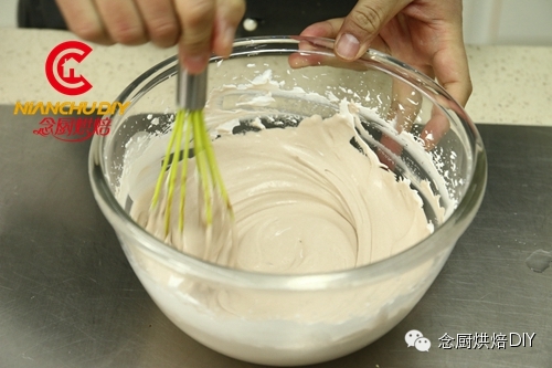 5、隔热水巧克力酱+牛奶明胶片混合物搅拌均匀。