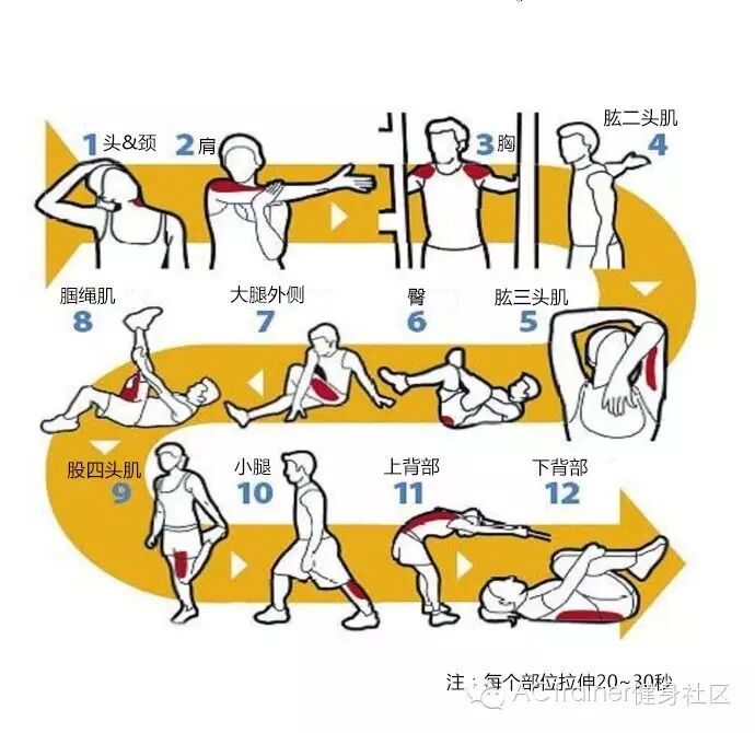 (训练前也可以按照此图简单拉伸一下,图中说每个动作坚持20~30秒,其实10~20秒就可以了,按照流程做一遍就挺好。)