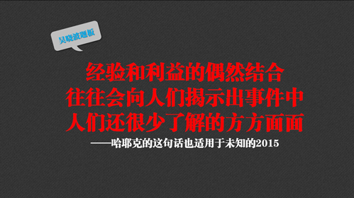 不得不说的是,2015年是充满了挑战的一年。为了让下一年更在掌握之中,我们必须遗忘30%的旧定律,淘汰50%的旧态度,接受100%的新可能。