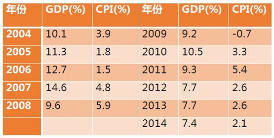 看了上面这一段枯燥的文字,小巴也和大家一样觉得很无聊,不过老师还另外给了一张图,就是中国过去十年的GDP与CPI。他说,虽然这两个指标非常简单粗暴,但是还是可以联系实际的经济新闻,结合两者可以从中去寻找一些些线索,来判定,过去十年各个年份以及现在是位于周期中的哪一个阶段呢?