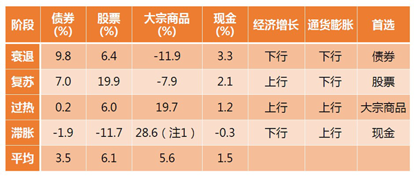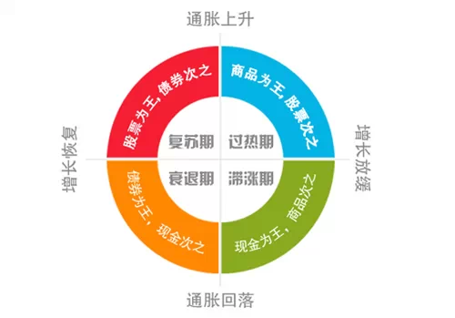 “美林时钟”是全球最大金融咨询服务公司之一的美林证券,通过分析1973-2004这三十多年的数据总结出的规律。它将经济运行周期分为四个时期,分别为复苏期、过热期、滞涨期和衰退期。
