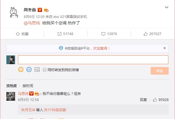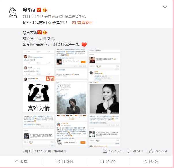 马思纯失恋,周冬雨必定是要陪伴在身边的啊,周冬雨还在微博上调侃说:给我买个空调,热炸了!马思纯也是乖乖的在评论区说我不给你扇着呢么?祖宗!莫名的从两位的对话中读到了甜蜜的感觉,哈哈,就像网友说的那样,果然还是七月与安生最搭配啊,欧豪可能只是中间的一个小插曲。