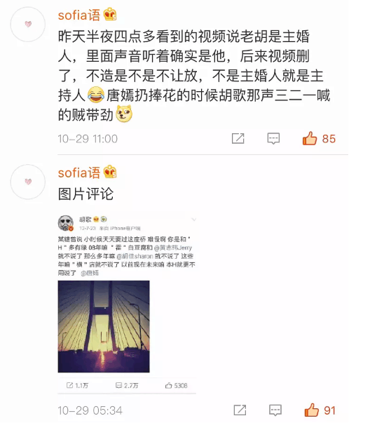 近日,有网友爆料:胡歌是唐嫣、罗晋维也纳婚礼现场的主持人,有很多粉丝转发的视频好像是胡歌主持的。还唱歌了,但是白天就删了……
