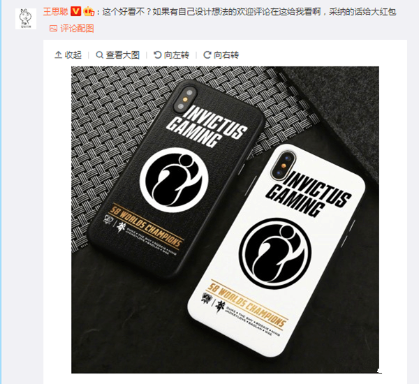 除了这些之外,还设计了纯金的奖牌,王思聪还把IG的LOGO设计成了手机壳,还在微博上公开征求网友的意见,并且意见被采纳的话还有红包,不过大家对于这个手机壳有什么奇思妙想呢?