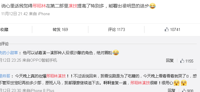 可以看到,很多网友都在赞同邢昭林的演技有了很大的进步,其实在第一部中,邢昭林的演技就很不错了,只是当时女主角的人设是一人分饰两角,比较出彩,相比之下,邢昭林的角色就没有那么的突出了,不过这么看来,第一部女主角精分,第二部男主角精分,真是一个神奇的剧组啊。