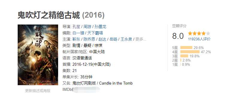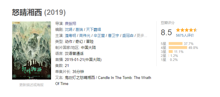 在《鬼吹灯》系列电视作品当中,有口碑优良的作品当然也有口碑扑街的作品。在《怒晴湘西》播出之前,三部《鬼吹灯》系列电视剧中,《黄皮子坟》和《牧野诡事》的口碑非常不好,从观众评分来看5.2和2.9的分数几乎可以称之为烂剧。只有由靳东主演的《精绝古城》8.0的评分还算优良。