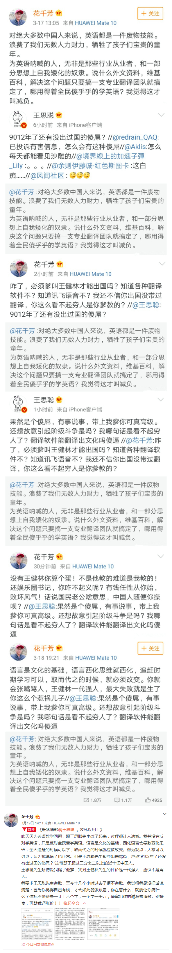 这件事情的起因是关于学生减负的讨论,花千芳和王思聪因为对“是否应该全民学英语”的认识不同而互怼,同时引发网民热议。花千芳认为“对于绝大多数中国人来说,英语都是一项废物技能”,王思聪显然不同意这个观点并进行了嘲讽,其中有一些“刺激性”的词汇令花千芳不满,要求王思聪道歉并赔偿“一个字一千万,一共十六个字”,小编按了半天计算器,要一亿六千万?不过,小编发现今天王思聪没有回应了,并且把关于花千芳的几条微博全部删除了。下面截图是整个事件来龙去脉!