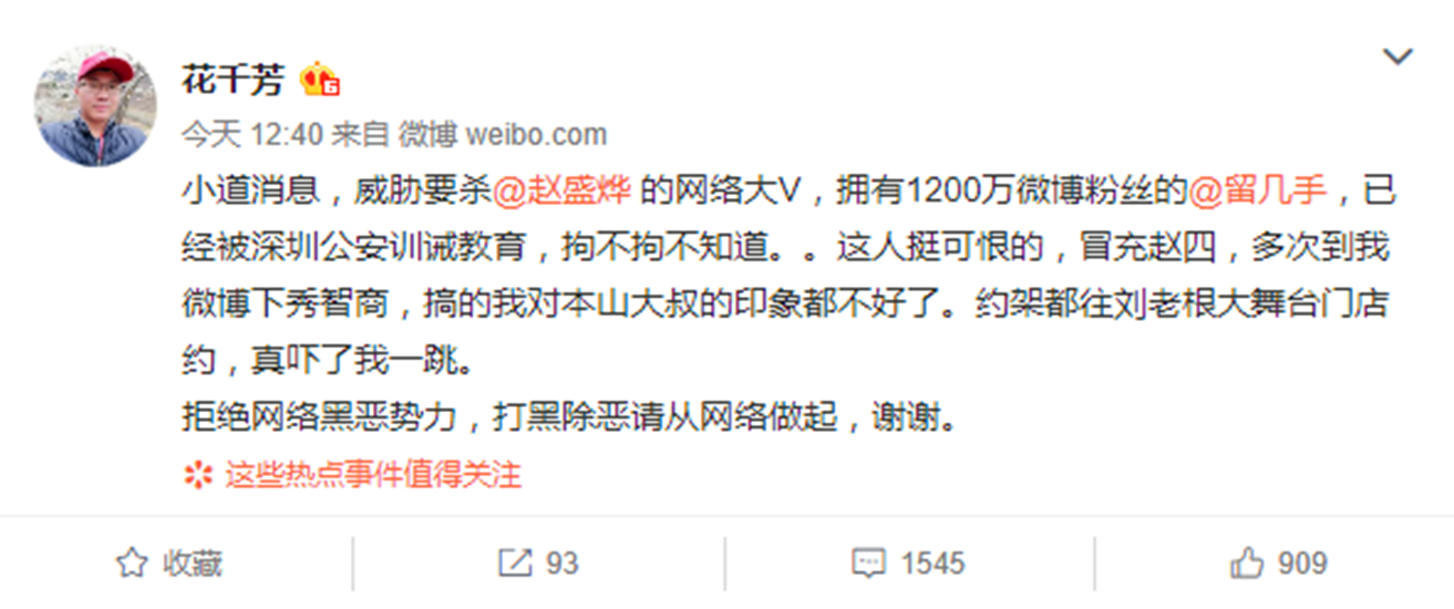 “花千芳”刚刚发布社交媒体称“拥有1200万微博粉丝的留几手,已经被深圳公安训诫教育,拘不拘不知道”,据小编观察,王思聪与“花千芳”互怼的几条微博也删除了,这是否表明这次起源于“是否要全民学英语”的网络骂战,以“花千芳”大获全胜收场?