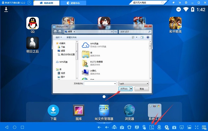 3、过一会儿你就可以看到已经安装好的超次元大海战游戏图标在天天模拟器我的桌面上。若天天模拟器没找到超次元大海战游戏,就在天天模拟器我的桌面界面,点击一下右下角apk按钮,到超次元大海战手游官网下一个游戏安装包添加到天天模拟器里面就可以啦!