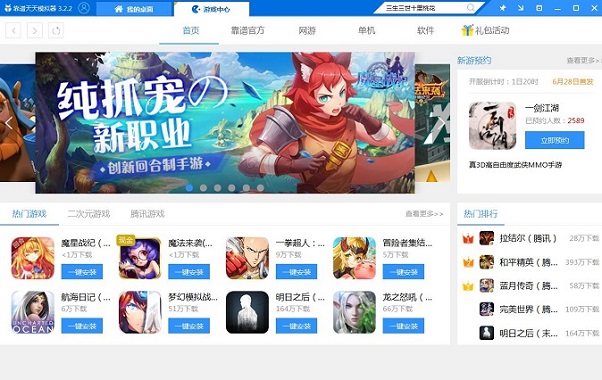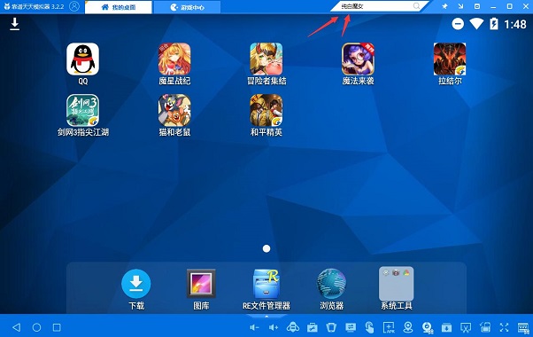 2、安装完成并打开,在天天模拟器的搜索框搜索“纯白魔女”,然后点击下载,安装到模拟器内。