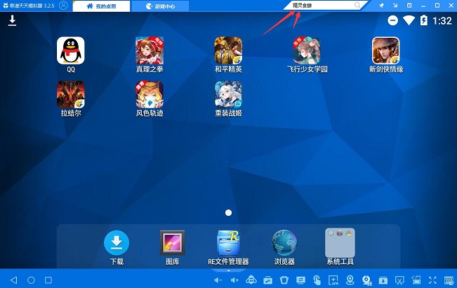 2、安装完成并打开,在天天模拟器的搜索框搜索“精灵食肆”,然后点击下载,安装到天天模拟器内。