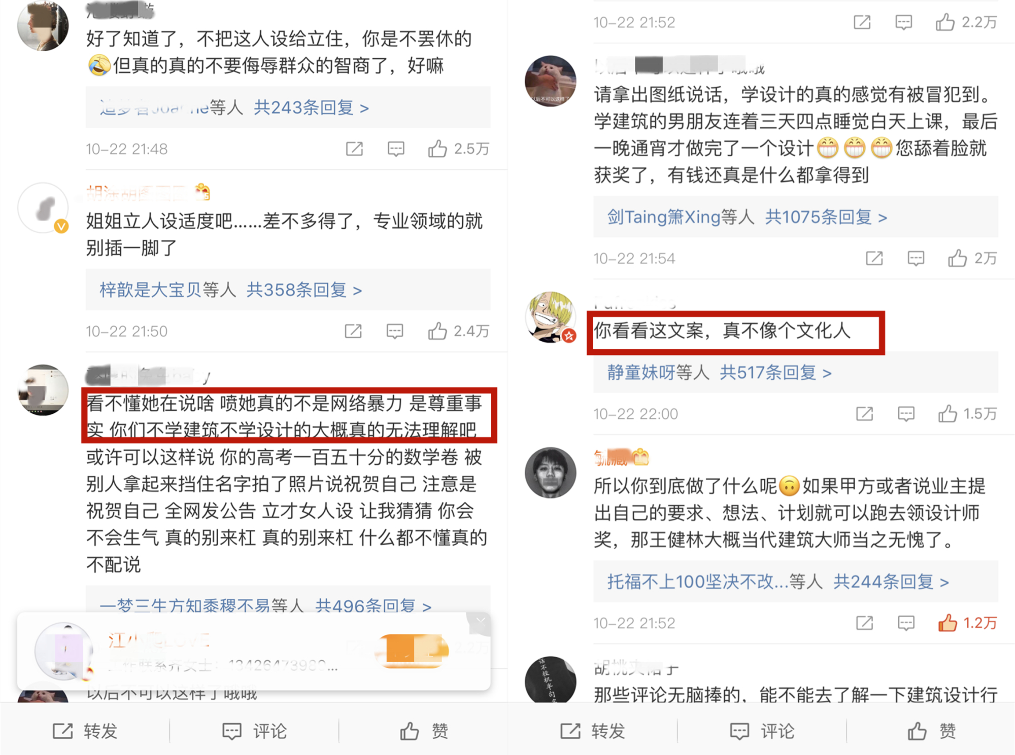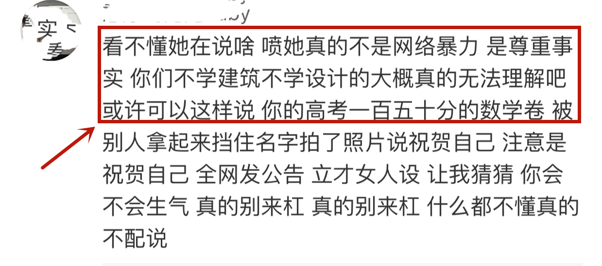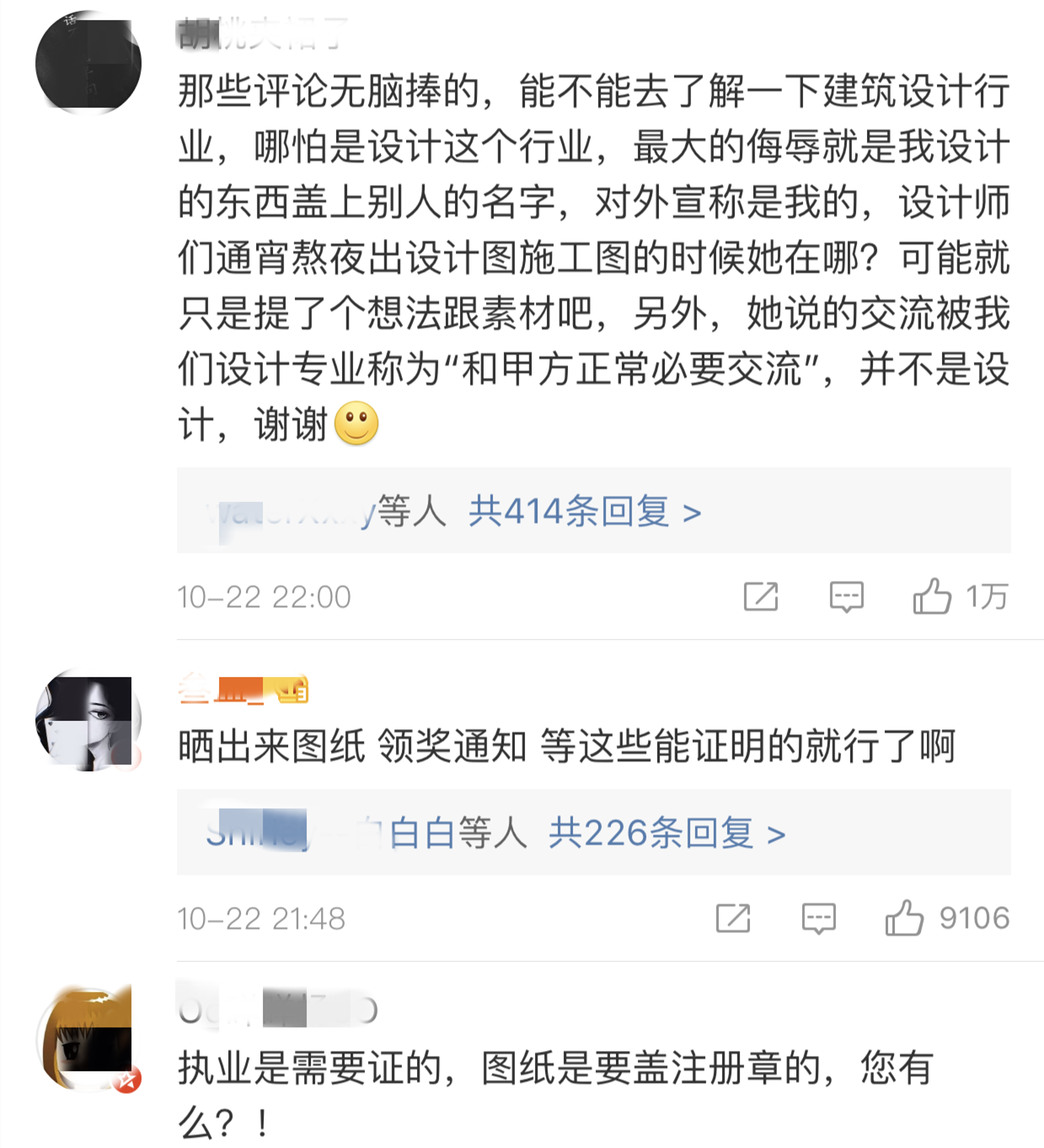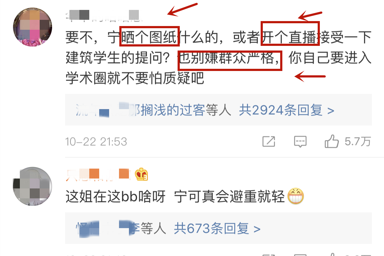 评论中,一名网友说道:晒个图纸,开个直播接受建筑学生的提问,自己进入学术圈都不要怕质疑。