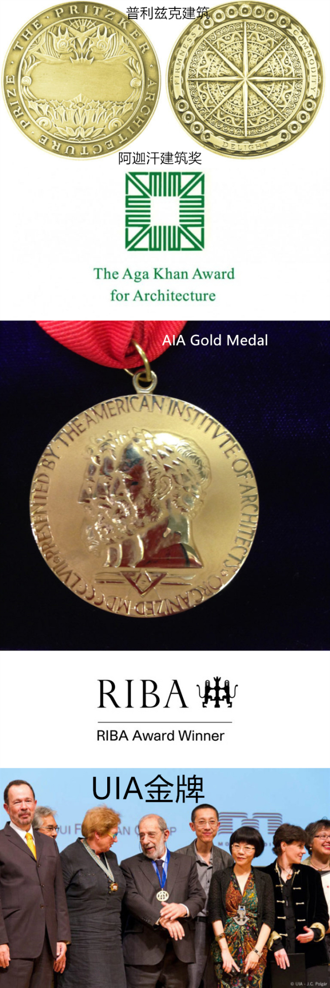 它们非别是普利兹克建筑奖,阿迦汗建筑奖,AIA Gold Medal,RIBA,UIA金牌。