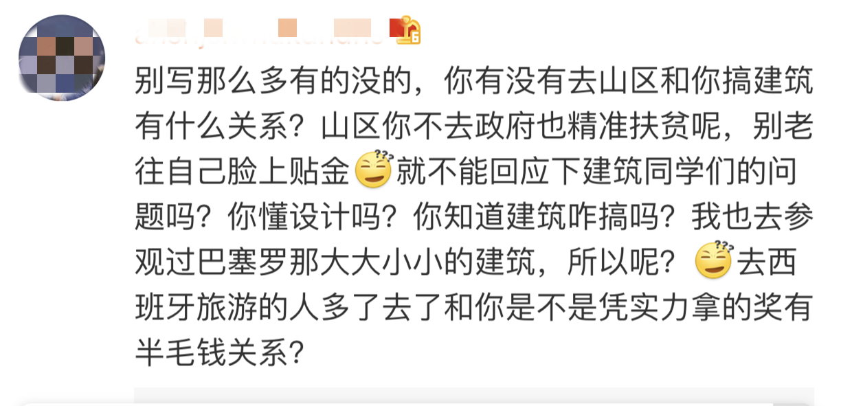 另外还有一名博主,在微博上说道:“别写这么多有的没得,你有没有去山区和你搞建筑有什么关系。”