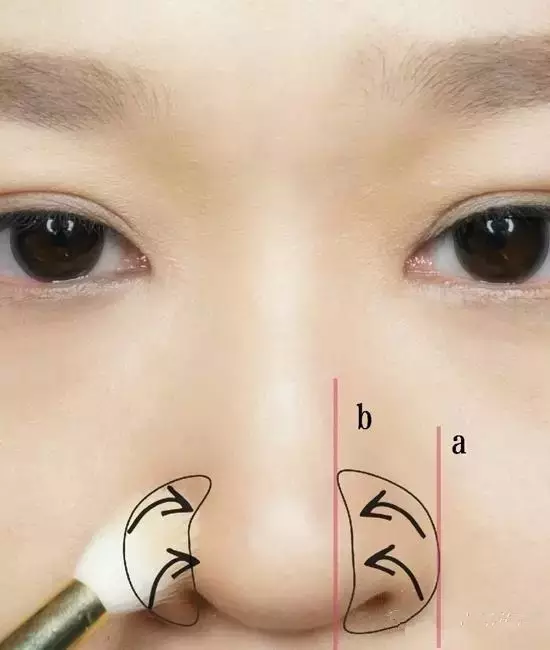 STEP1:用阴影刷沾取阴影粉后在手心或者虎口揉一揉,确保阴影粉均匀的附着在刷毛上后,从鼻翼的根部a点起笔单向的刷向鼻翼与鼻头的沟壑b点。