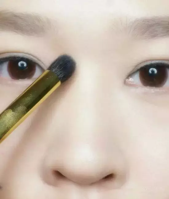 STEP2:将晕染刷上多余的阴影粉在纸巾上擦干净也不要再去沾取新的阴影粉,在刚刚上图的基础上将两个最重的区域晕染开。分别向眉头处、鼻梁和鼻头以及最后向鼻翼带过一下的晕染,将色块都晕染开为止。
