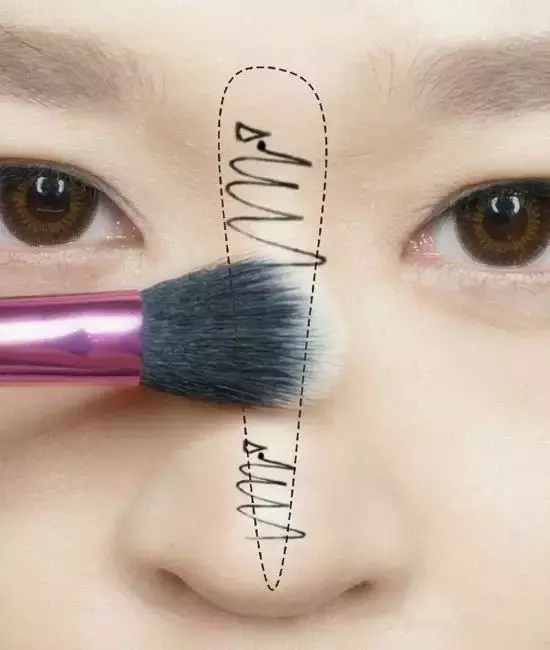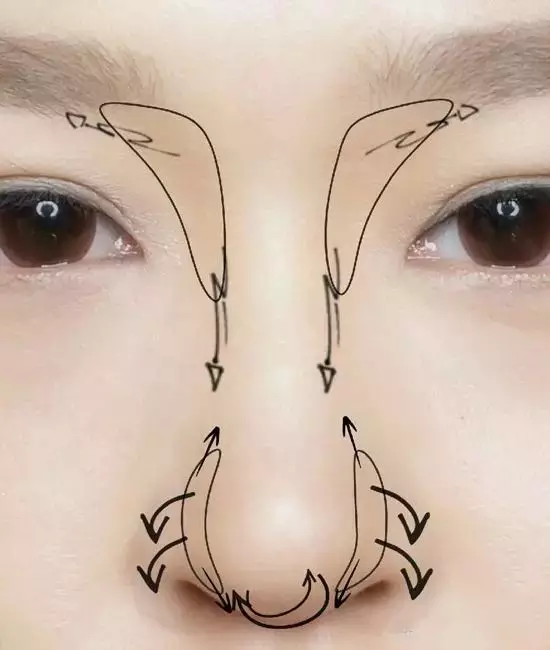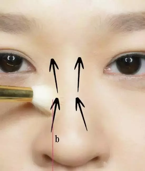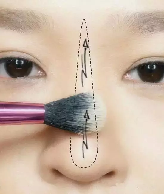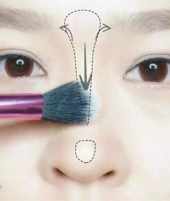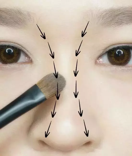 STEP1:用扁头眼影刷沿着鼻梁两侧如同图中箭头指示一般从眉头处用“描”的形式,晕染到鼻头及鼻翼中间凹陷处,切勿化歪,否则鼻梁看起来就是歪的了。