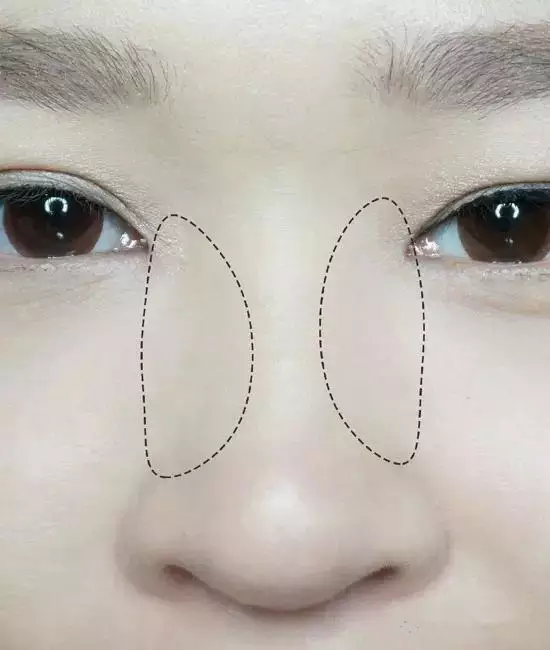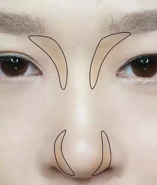 STEP1:如果鼻梁比较宽,切记不要试图用阴影粉在图中圈住的地方一直打阴影粉,试图让鼻子挺拔,因为鼻梁宽的部分也是有阴影的,如果一味的在宽的地方扫阴影粉只会让比较变得非常塌。