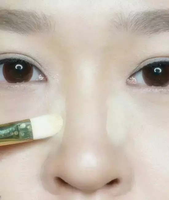 STEP3:阴影最怕的就是高光区域和阴影区域有明显的界线,那样鼻子看的就很奇怪,外人一看就是鼻影大得很不高超,所以我都会利用哑光高光粉将之前阴影边界处柔化一下,将高光和阴影完美的融合起来。
