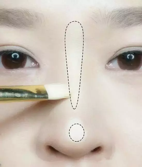 STEP1:用比自身肤色浅的夜吻QQ霜或者修容膏在画阴影前现在鼻梁处遮瑕刷沾取膏状高光点在如图的位置,然后用海绵拍开,接着再进行之前说的那些步骤即可,三种鼻影方式根据自己条件选择。