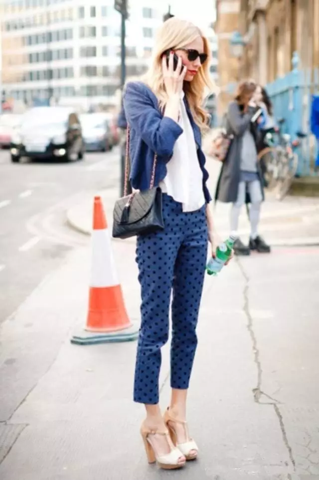 中高腰波点九分裤有小清新的感觉,高跟鞋拉长了比例和增添小女人的感觉。