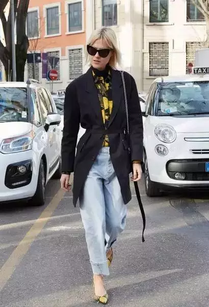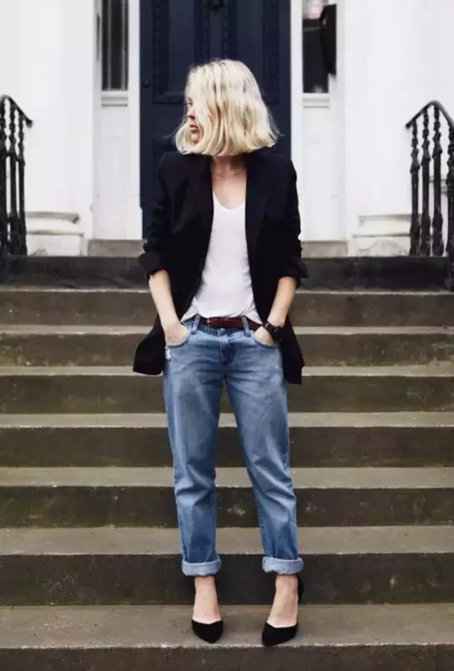 宽松的男朋友款牛仔裤,卷起裤边,和高跟鞋搭配在一起毫无违和感,还别有一番风味。