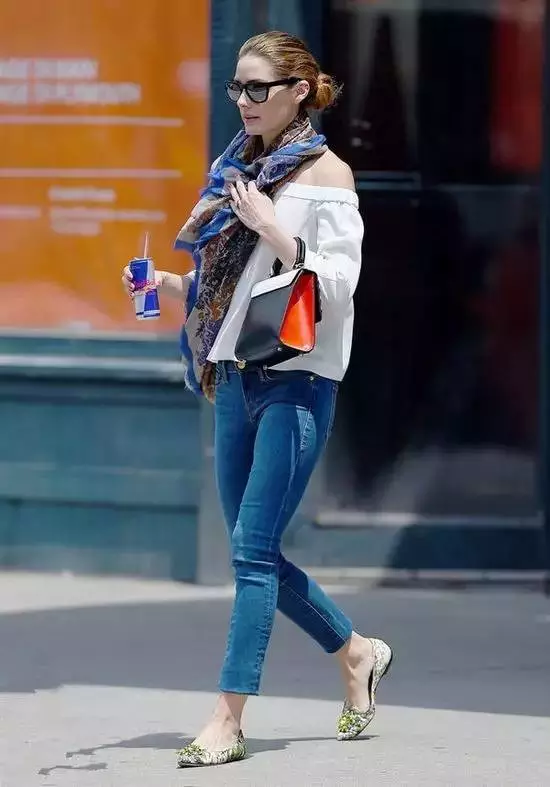 穿着白色一字领上衣,搭配九分牛仔裤和绿色印花平底鞋,蓝色的印花丝巾带来了几分异域风情,为简单的搭配增色不少。