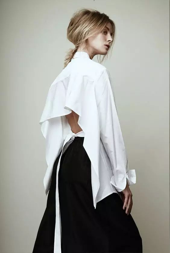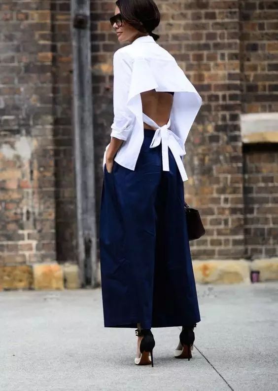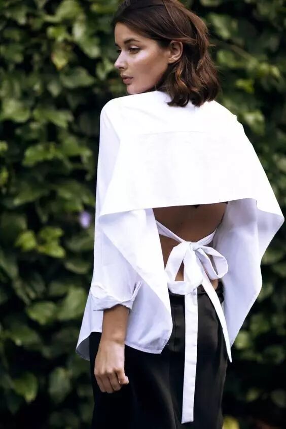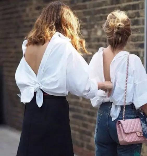 比较流行的款式就是后背挖空并有两条系带~总结了飘带和随性衬衫的两大元素~这一单品一定要入手!搭配阔腿裤或者紧身裤都足够时髦!▼