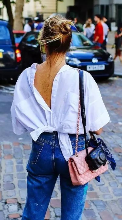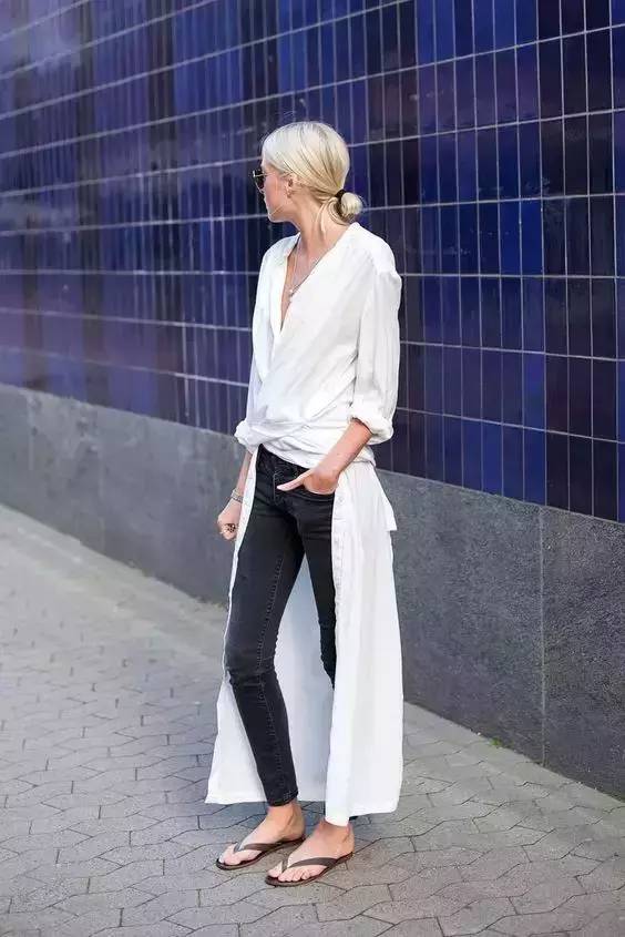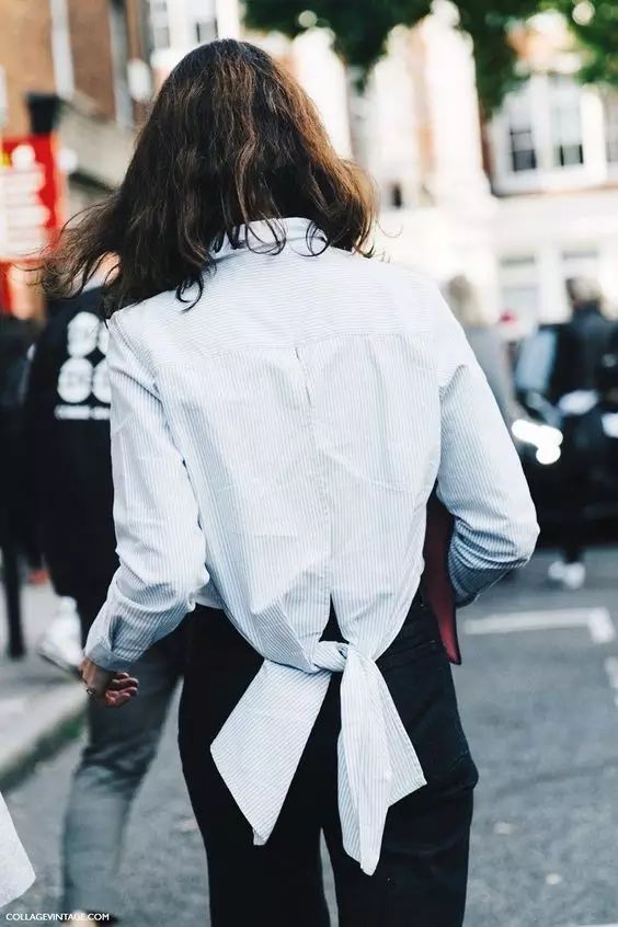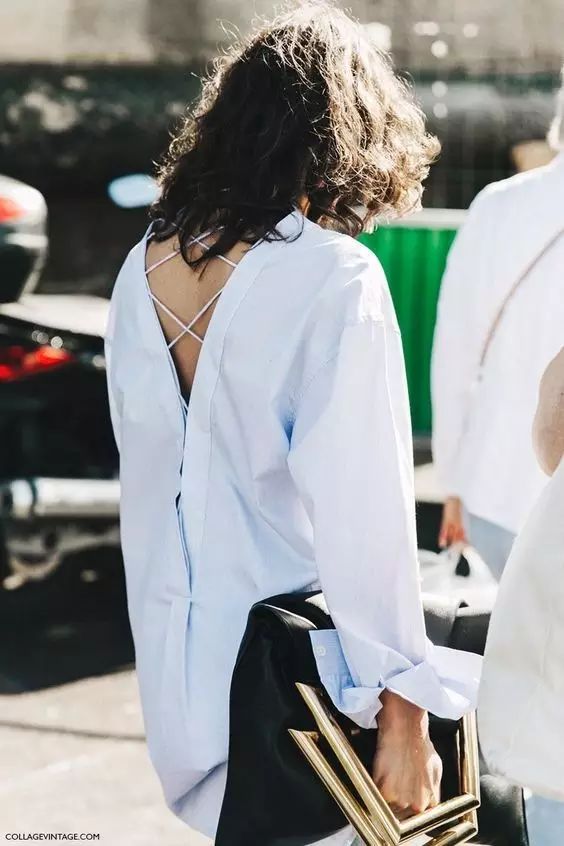 如果你不想入手新的露背衬衫单品~Eason当然有又省钱又时髦的方式!只要把衬衫反过来穿就可以~从上往下扣随性仙气~从下往上扣先打个结,看起来更CHIC!▼