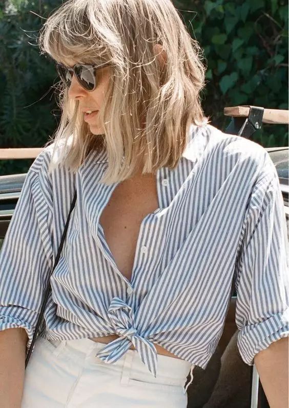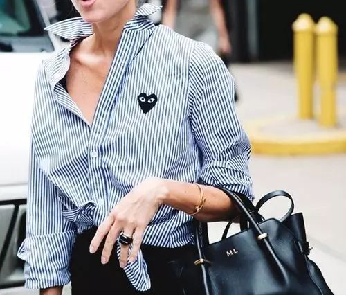 平时看起来比较正式的衬衫也可以通过一个小绑结变得有趣很多,最简单的方法就是把下摆交叉打结~▼