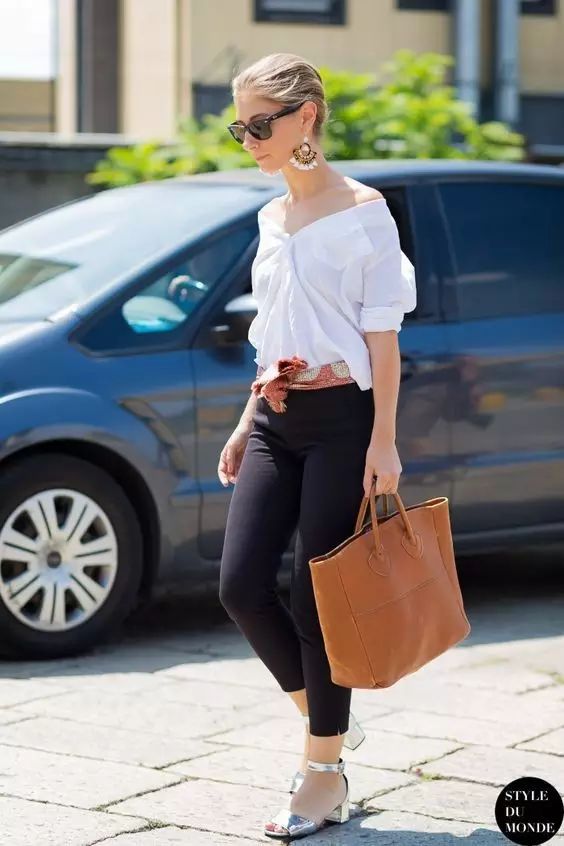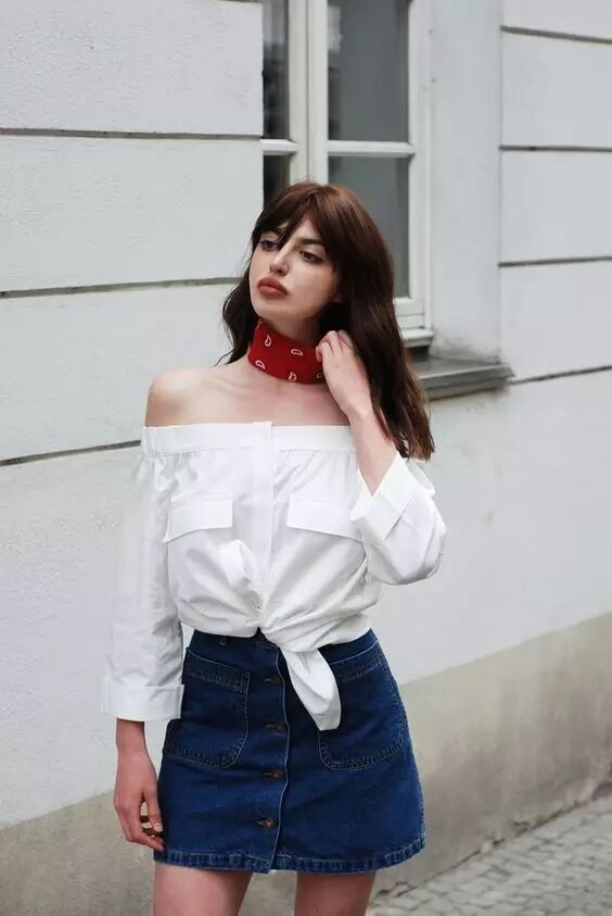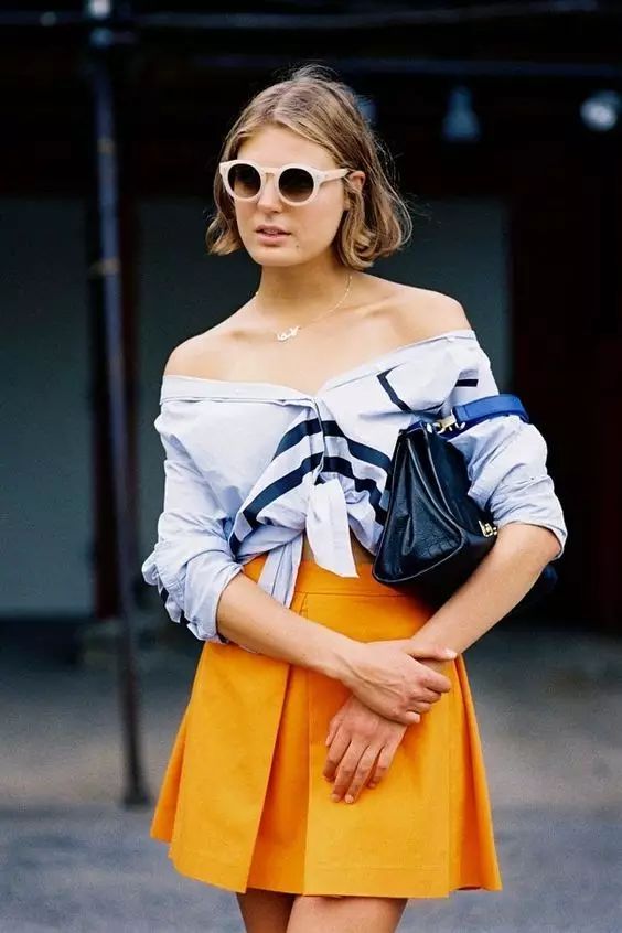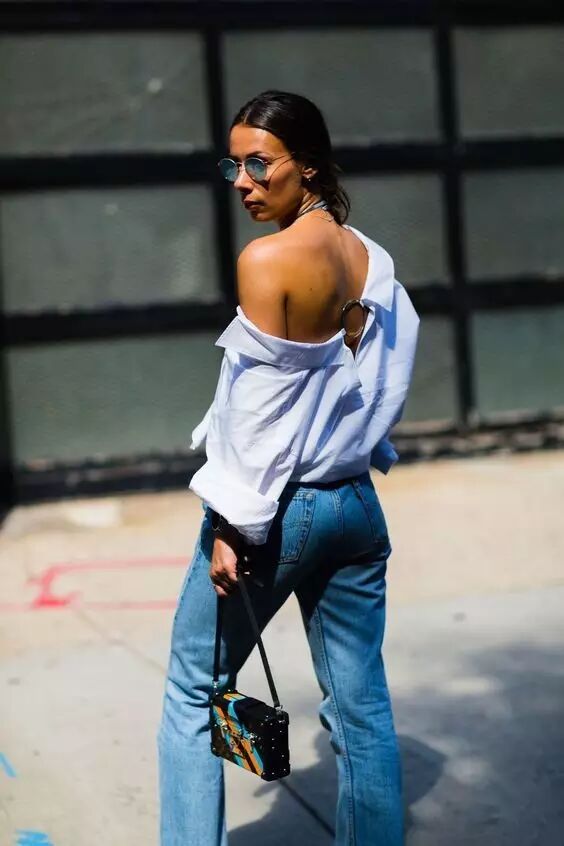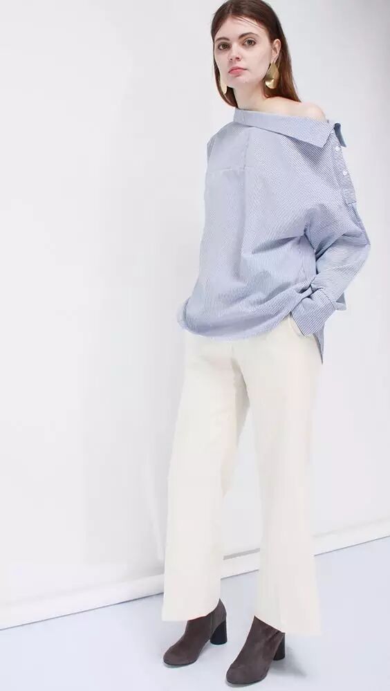 如果你不想买新的露肩单品~普通的衬衫也完全可以自己DIY成单露肩的款式,少扣几个扣子,拉大领口再打个结~LOOK就完成啦!▼