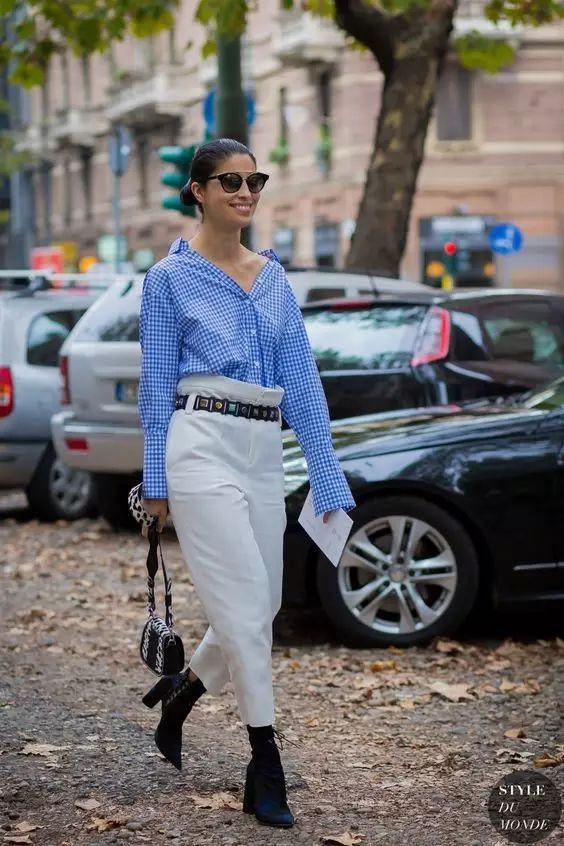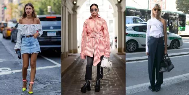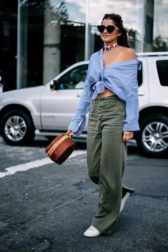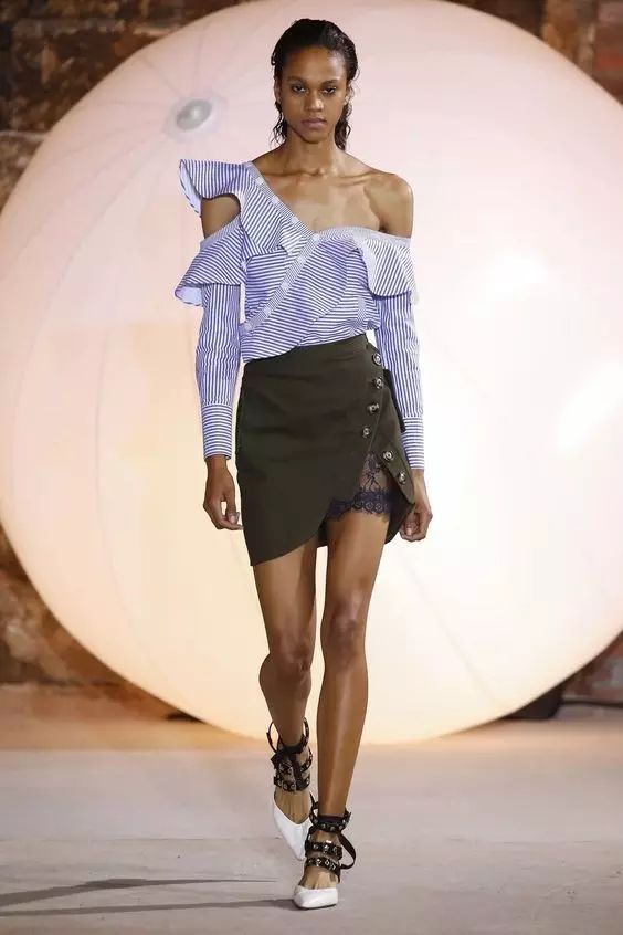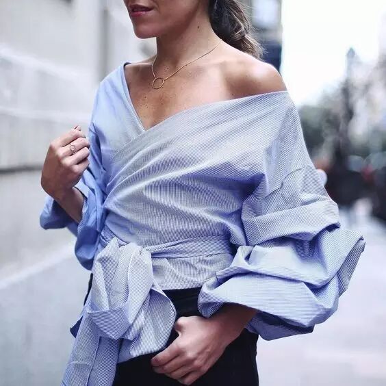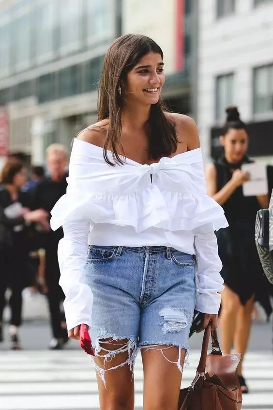 之前Eason写过关于2017的时髦元素里,荷叶边是绝对的重头戏~同样可以搭配在衬衫上~荷叶边衬衫用同样的方法拉成露肩款式并打结一衣多穿!▼