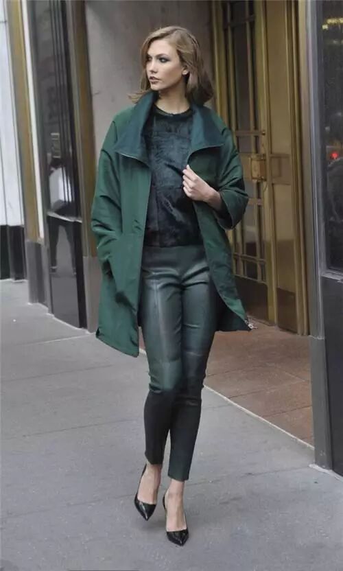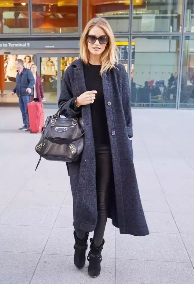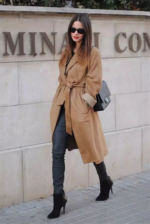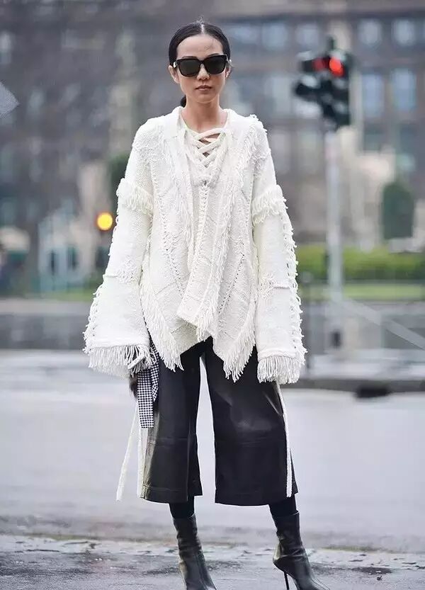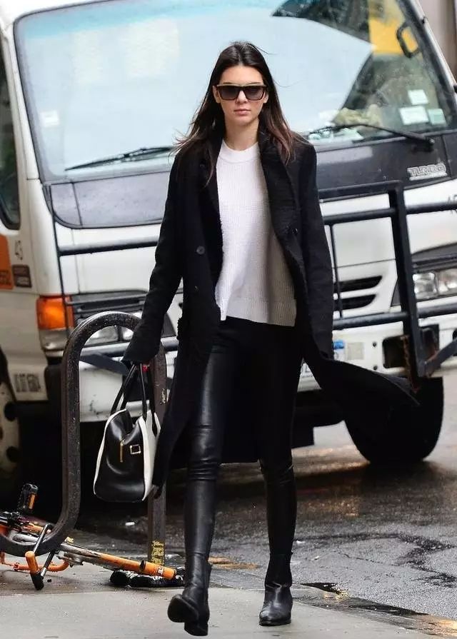 紧身皮裤搭配浴袍大衣和长款针织衫也很好看,再搭配一双短靴就时髦加倍啦~~~▼