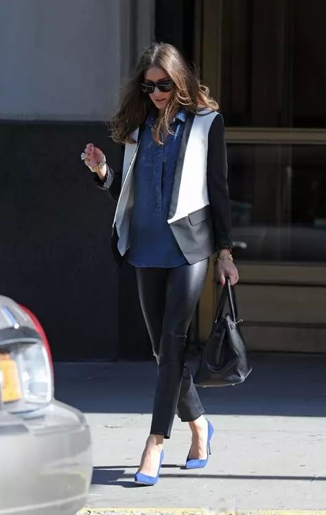 Olivia和安妮海瑟薇搭配宝蓝色尖头高跟鞋,不但显高,提亮的效果也很出彩。▼