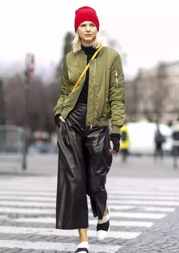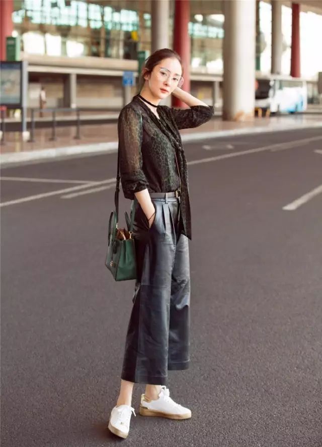 除了紧身皮裤,近年皮质阔腿裤也被受追捧,拥有修饰腿型的优点。▼