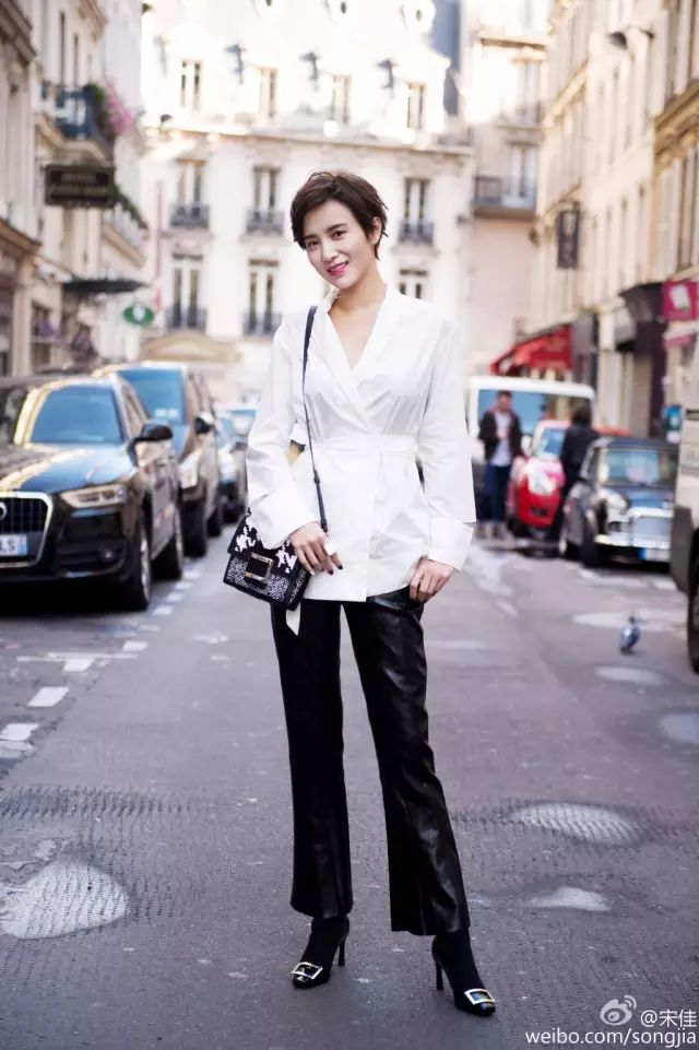 最爱极简风格的金小妹一直对皮裤自然宠爱有加,最擅长黑白配,拿的包包都是呼应全身的造型。▼
