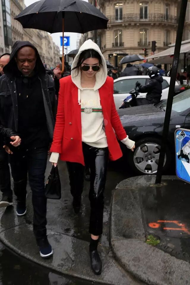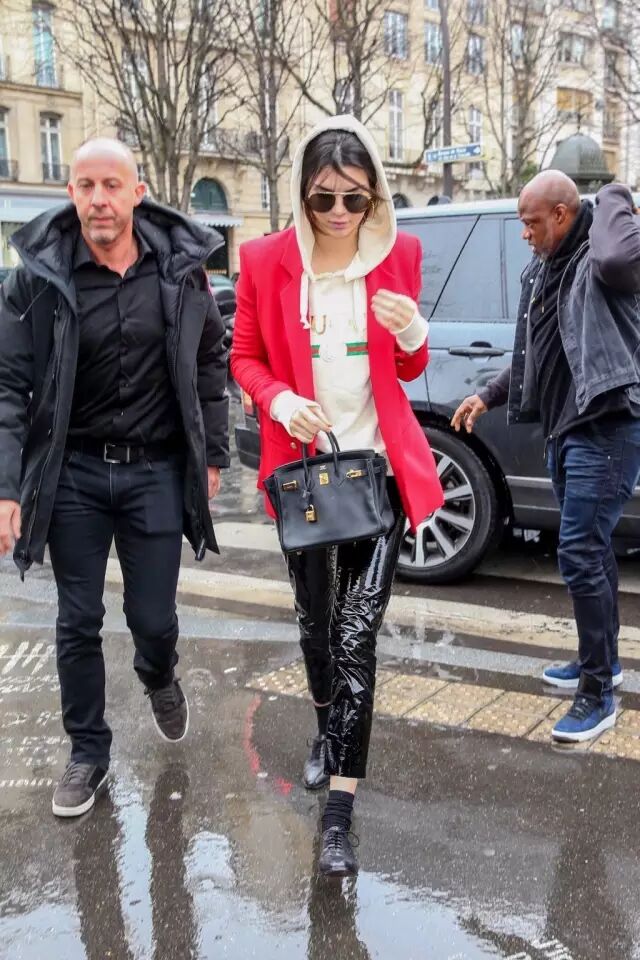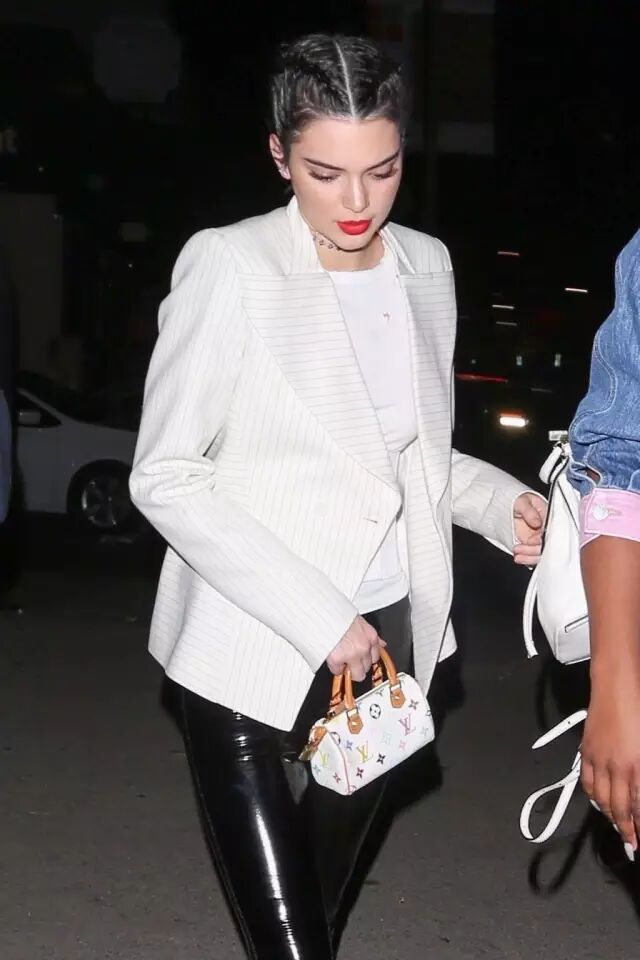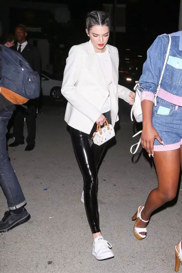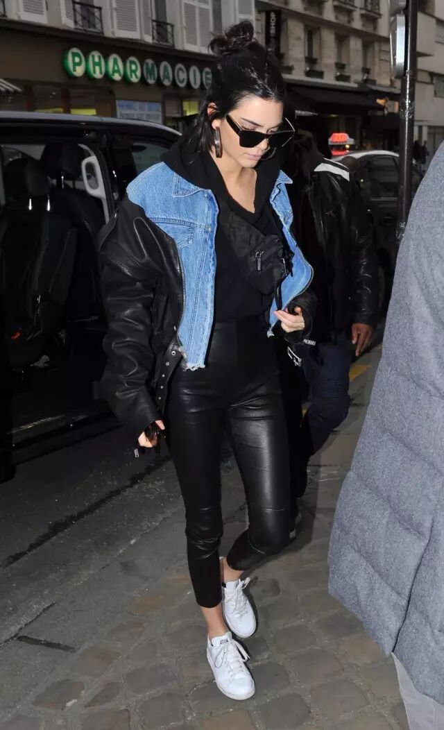 Jenner在最近的街拍里多次穿皮裤出镜,大部分她都是打造上宽下窄的感觉。▼