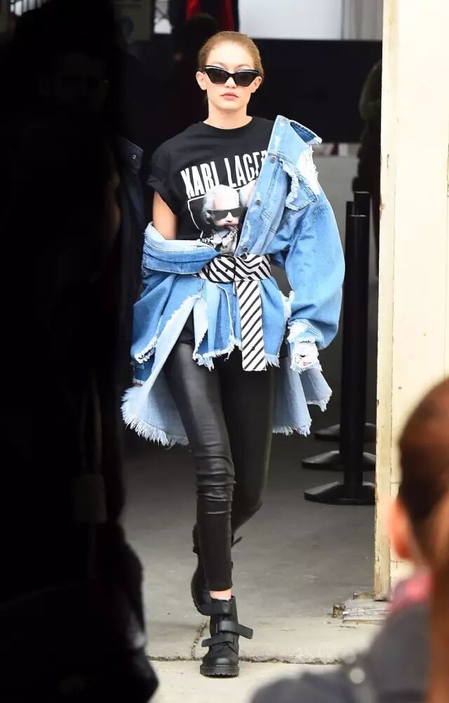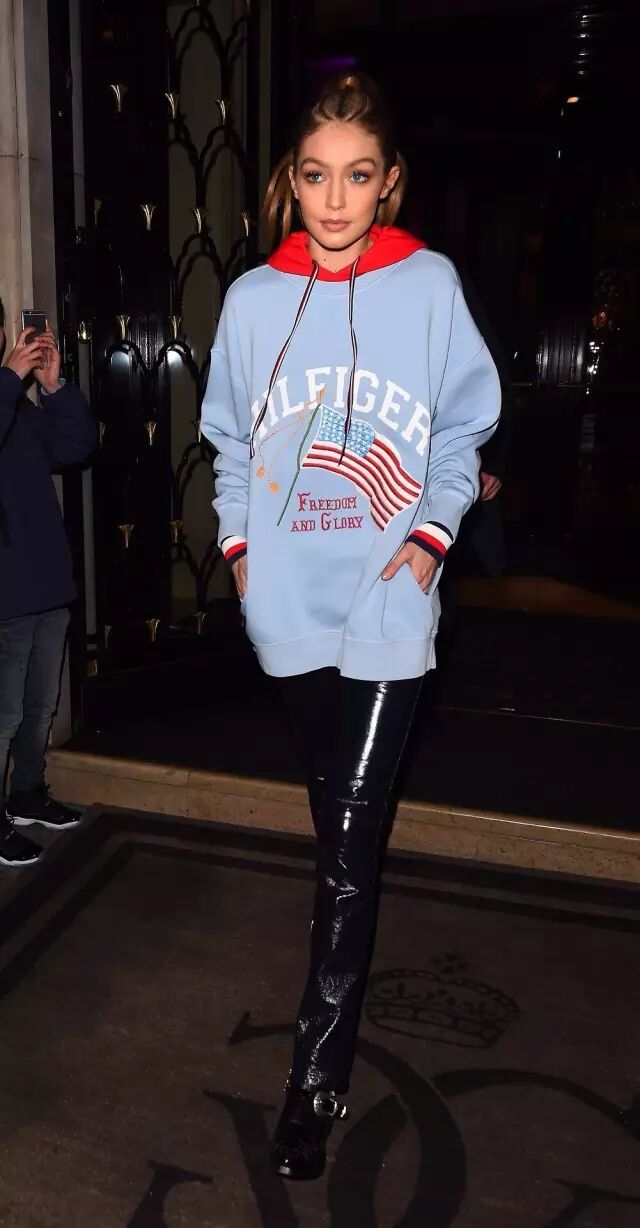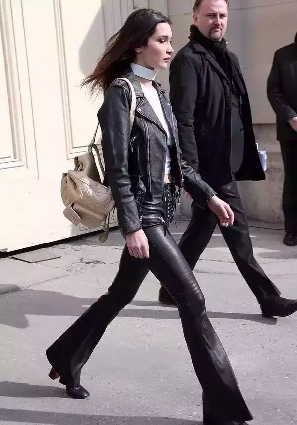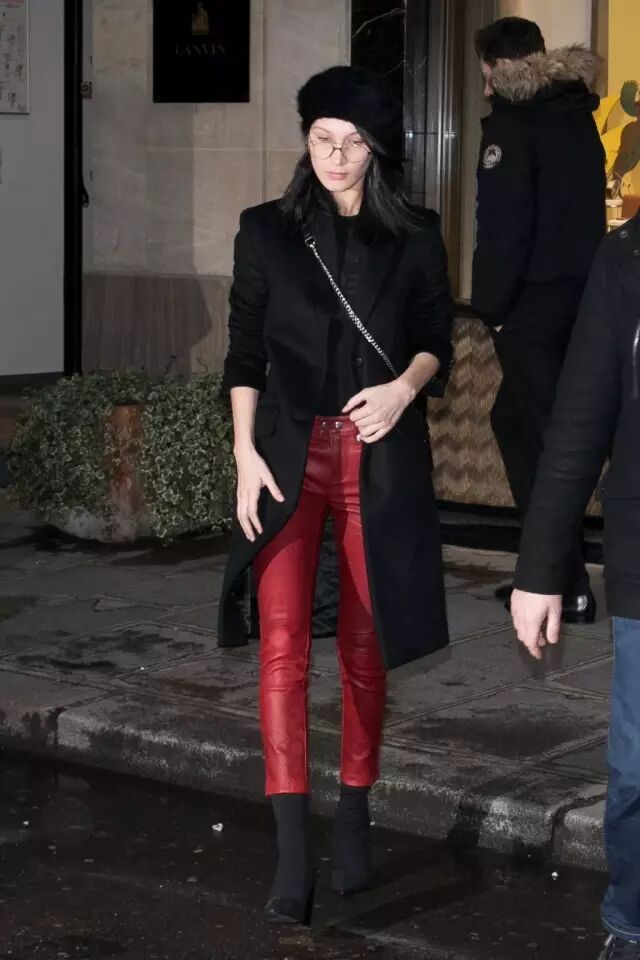 Hadid经常选择暗色的皮裤搭配明亮的上衣,轻微的撞色很有味道,随性的外套卫衣顺利减轻了不少皮裤的“土气”。▼