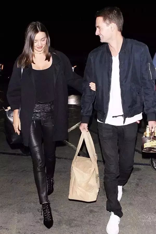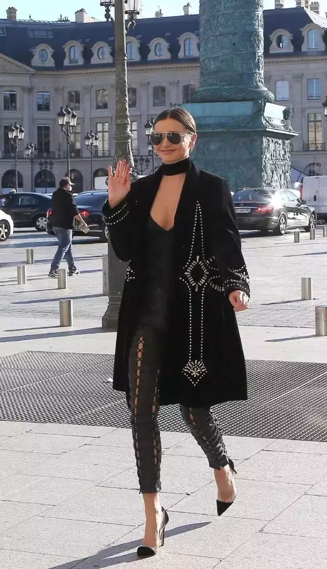 Miranda Kerr身穿绑带设计的皮裤搭配低胸内搭和长大衣,再穿上高跟鞋优雅又性感。▼