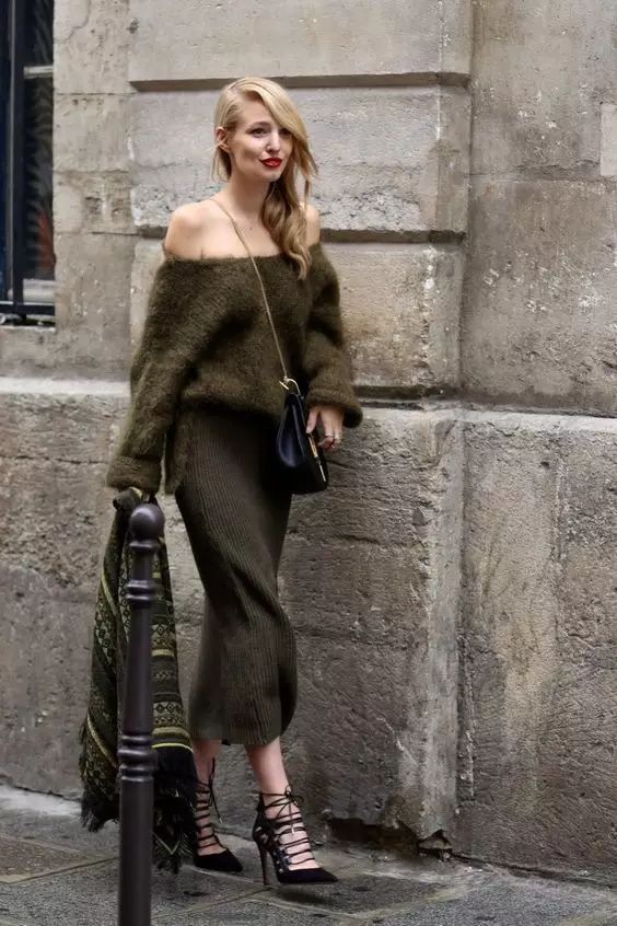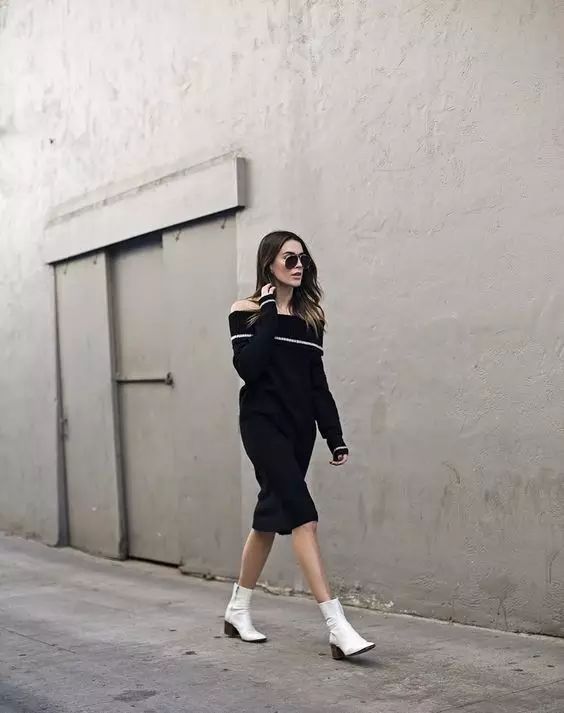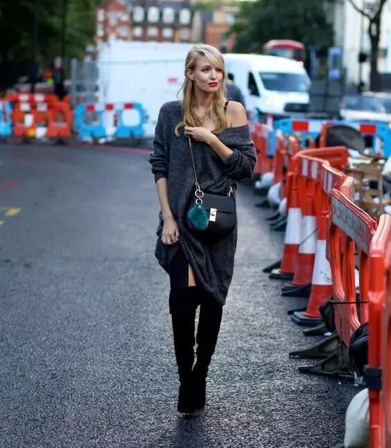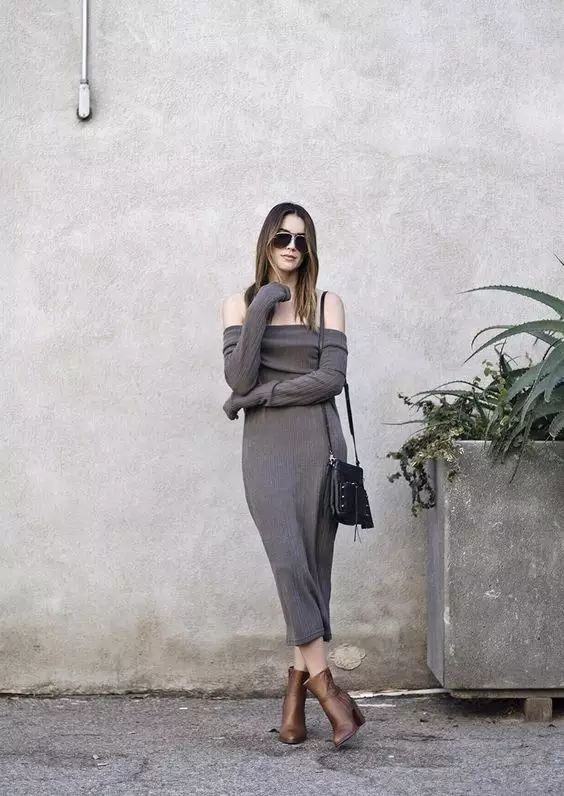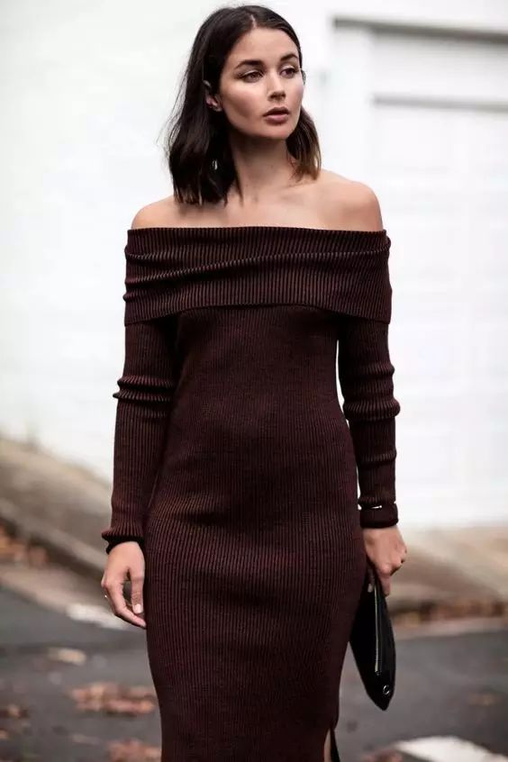 露肩针织连衣裙也很性感迷人噢!可以买领口大一些的款式,直接拉到肩部就有露肩的效果啦~小只的小马达要选择短款噢!膝上10厘米的长度,搭配过膝长靴包你显高又显瘦~▼