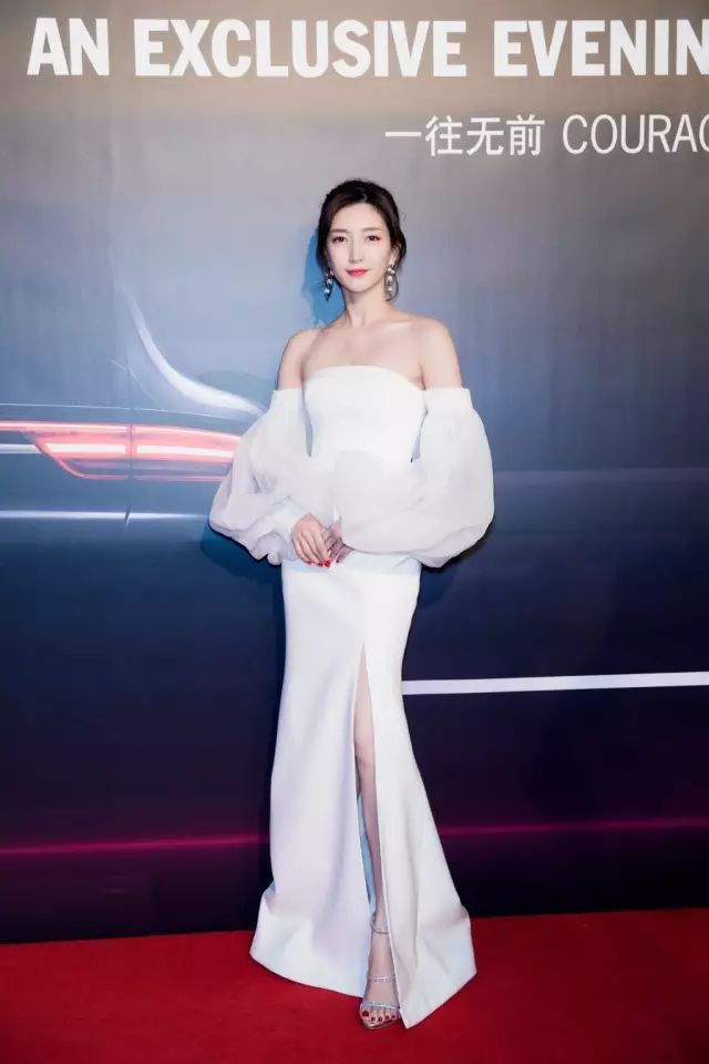出席活动江疏影选择了这套露肩灯笼袖礼裙